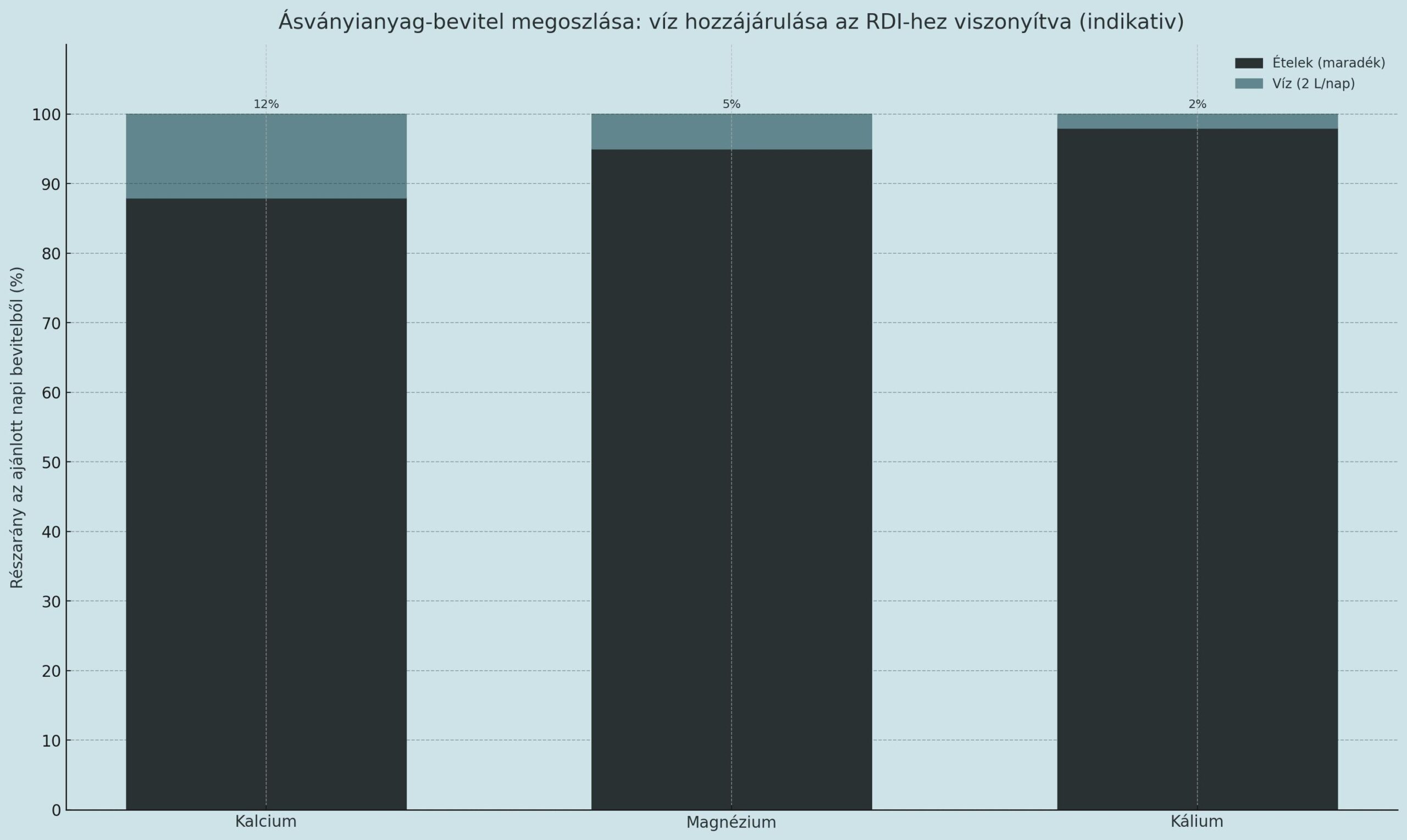 Ivóvíz: Bizonyos mértékben a csapvíz és palackozott ásványvíz is tartalmaz ásványi anyagokat, de – mint látni fogjuk – semmiképp nem ajánlott elsődleges forrásként számítani rájuk. Fontos megjegyezni, hogy a csapvíz ásványianyag-tartalma területenként változó (a víz eredetétől, a geológiai viszonyoktól függően). Magyarországon a vezetékes ivóvíz többnyire megfelelő minőségű és nyugodtan fogyasztható, de ásványianyag-tartalma általában közepes vagy alacsony, ellentétben néhány palackozott ásványvízzel, amelyek bizonyos esetekben magasabb oldottanyag-tartalommal bírnak. A palackozott vizek között nagy különbségek lehetnek: léteznek nagyon alacsony ásványianyag-tartalmú vizek (kevesebb, mint 50 mg oldott anyag literenként), de vannak kifejezetten ásványi anyagban gazdag ásványvizek is, akár 1000–1500 mg/liter összes oldott ásványi anyaggal. A víz ásványianyag-tartalmának kérdését a következő szakasz tárgyalja részletesen.