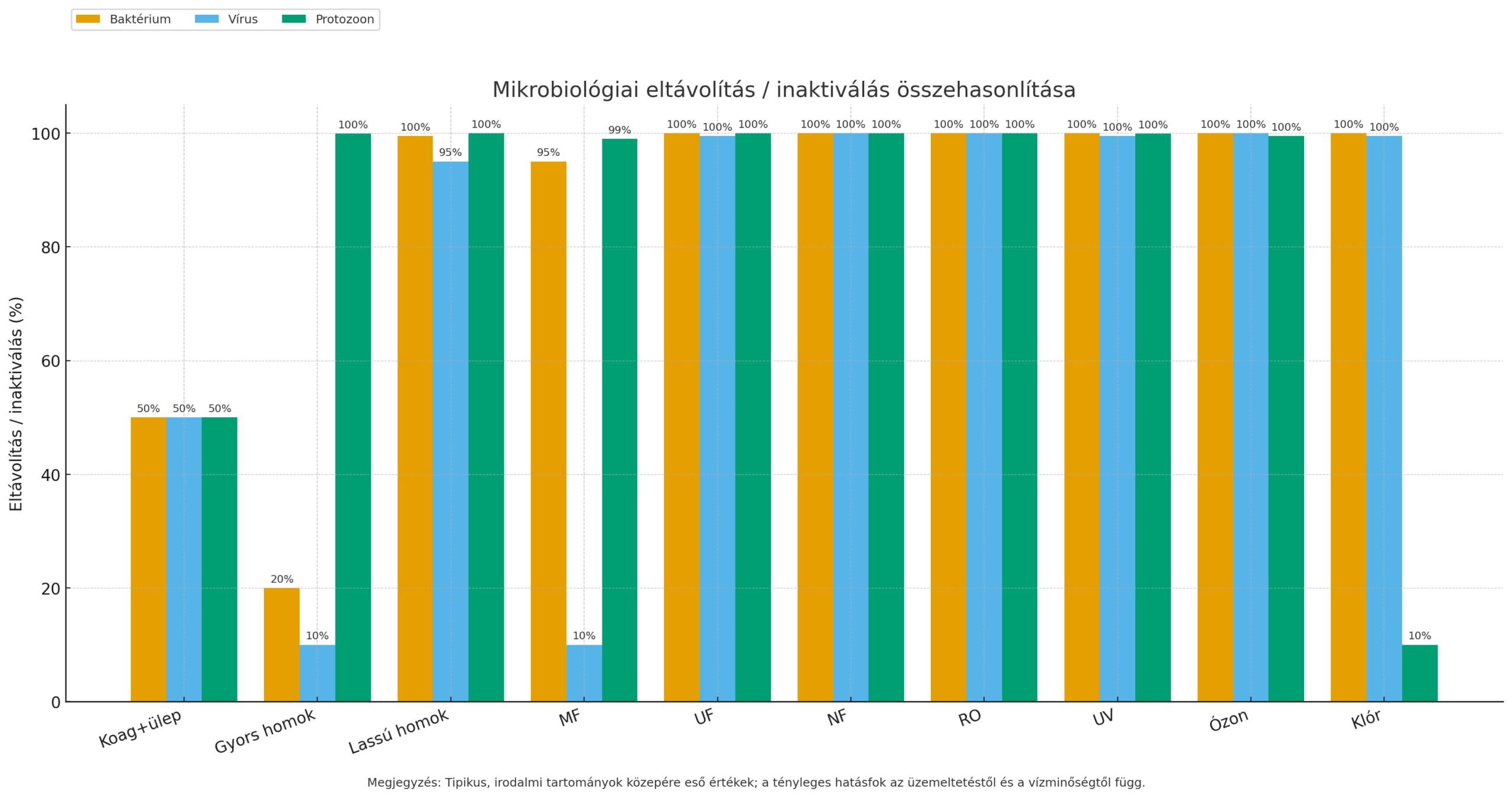 Koaguláció + ülepítés Zavarosságot okozó kolloidok, lebegő anyagok, színanyagok; velük együtt némi mikroba is Turbidity: >90%; Baktériumok: ~30–80%; Vírusok: ~30–80%. Csak a pelyhekhez kötött kórokozókat viszi le, önmagában nem ad biztonságos vizet. Felszíni vizek előkezelése nagy lebegőanyag- és NOM-terhelés esetén.