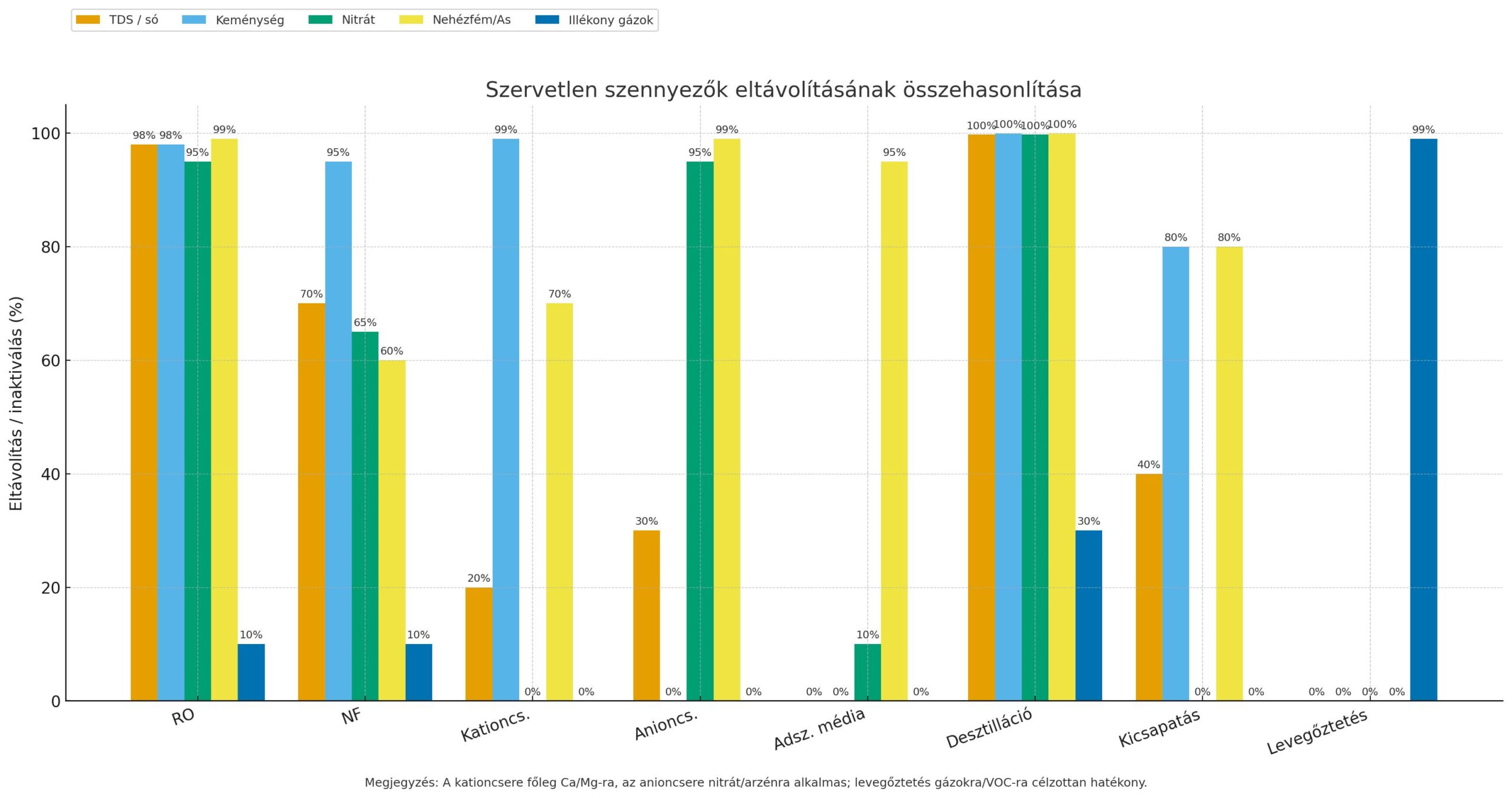 Desztilláció Gyakorlatilag minden szennyező (kivéve illékonyak): sók, nitrát, baktérium, vírus, nehézfém, stb. Só, nitrát, fém eltávolítás: ~99.5–99.9%; Baktérium, vírus: 100% (forralás sterilizál); Illékony szervesek: nem teljes (elő/utószűrés javasolt). Kisméretű alkalmazások tiszta víz előállítására, pl. labor, akkumulátor, túlélő készlet. Ivóvíztermelésre nagyban nem gazdaságos az energiaköltség miatt.