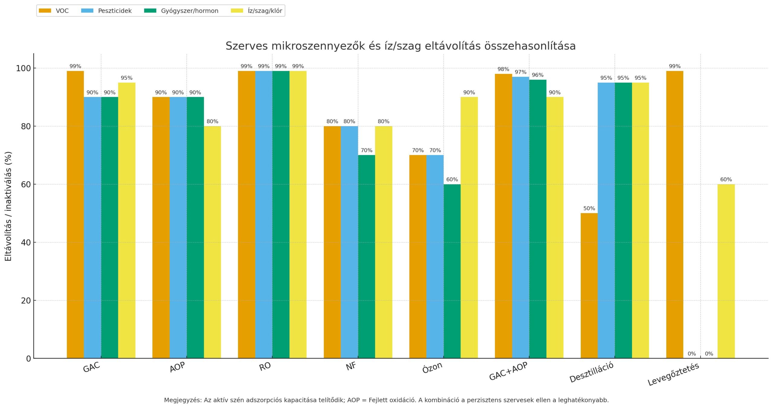 Aktív szén + AOP kombináció Szerves mikroszennyezők teljes eltávolítása (pl. gyógyszermaradványok, peszticidek) GAC adszorpció + oxidáció szinergikus: sok mikroszennyező >95%-ban lebomlik és/vagy megkötődik. AOP külön: pl. 1,4-dioxán >90% UV/H<sub>2</sub>O<sub>2</sub>-val. Fejlett ivóvízművek kiegészítő lépcsője a „jövőbeni” szennyezők ellen; szennyvíztisztítás 4. fokozataként is terjed. Magas beruházási és üzemköltség, speciális szaktudás igény.