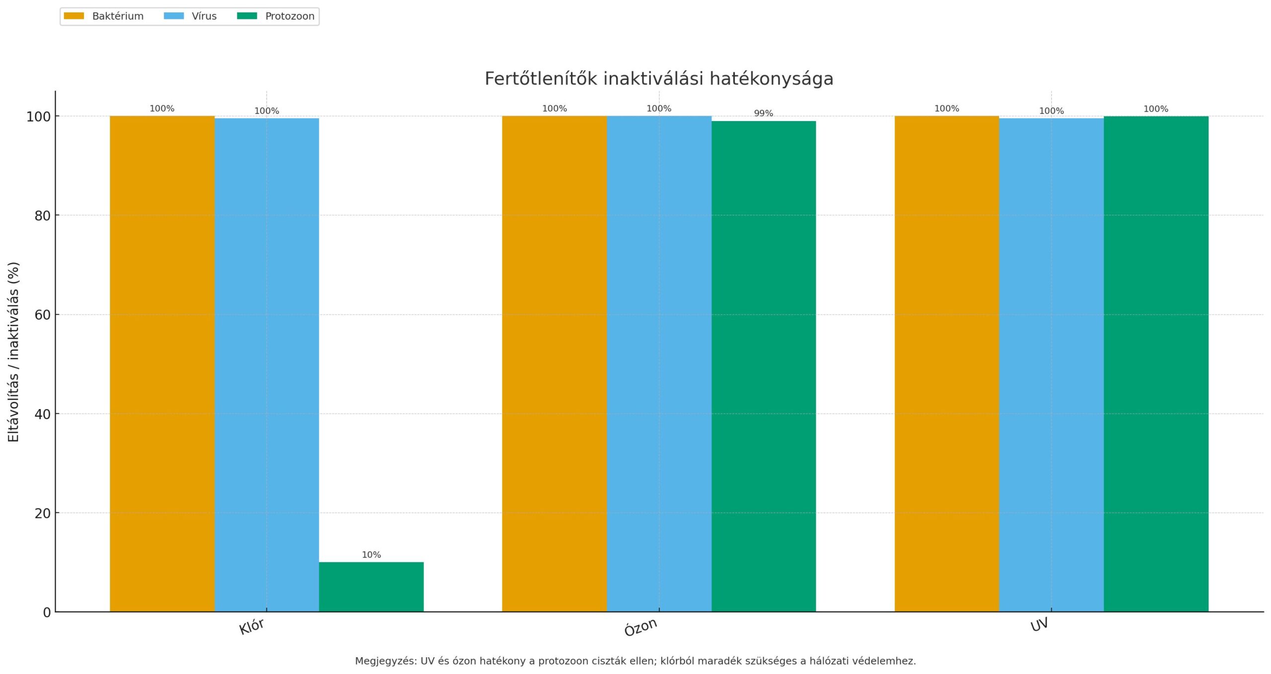 Klórozás (Cl<sub>2</sub>, HOCl) Baktériumok, vírusok (rendkívül hatékony); protozoák (csak csekély hatás Giardia, Crypto ellen) Baktériumok: 4–6 log (99.99–99.9999%) inaktiváció kis CT mellett; Vírusok: 2–4 log (99–99.99%) a legtöbb esetben; Crypto: gyakorlatilag 0 log (ellenálló). Széles körben alkalmazott fertőtlenítő ivóvízhez, uszodavízhez. Egyedül is elegendő baktériumok/vírusok ellen, de érdemes szűréssel kombinálni a paraziták miatt. Olcsó, maradék klór véd a másodlagos szennyezéstől.