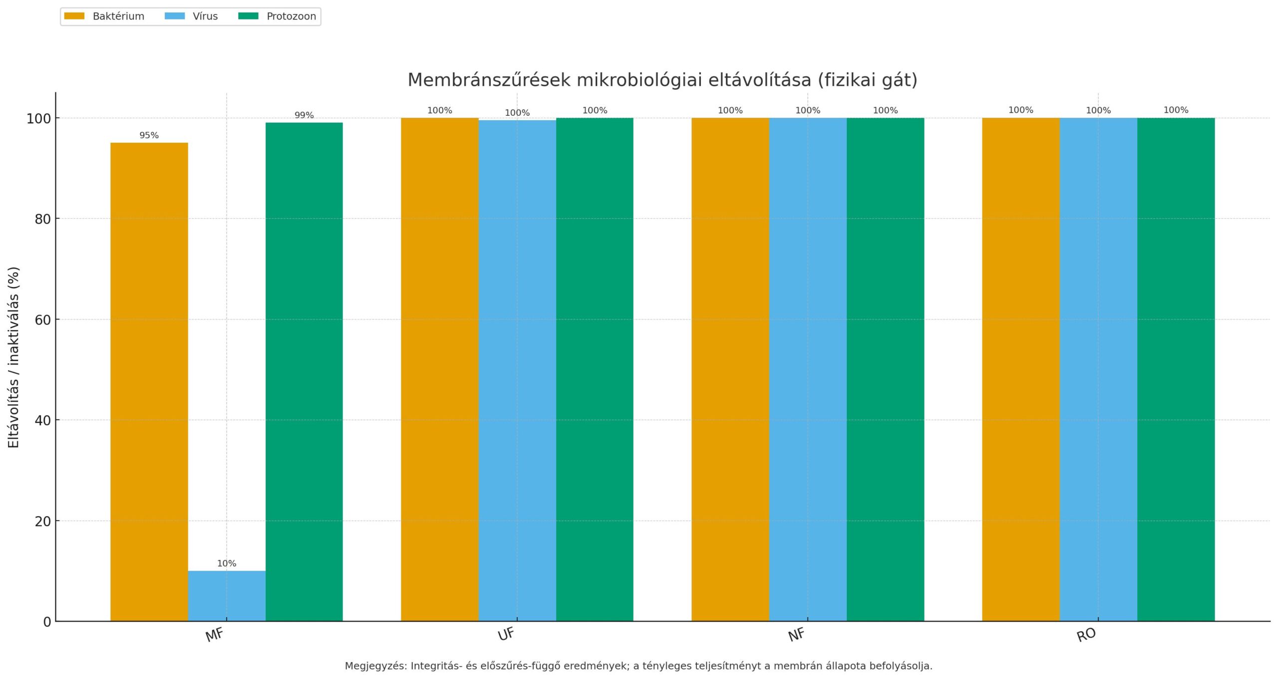 Mikroszűrés (MF) 0,1 µm-nál nagyobb részecskék: baktériumok, protozoák, üledék Baktérium: ~90–99%; Protozoa (Giardia, Crypto): ~99% (2 log); Vírus: alacsony, 0–1 log (szinte szabadon átjutnak). Membrános előszűrés homokszűrő helyett vagy után; pl. vízművek finomítására, ha extra biztonság kell.