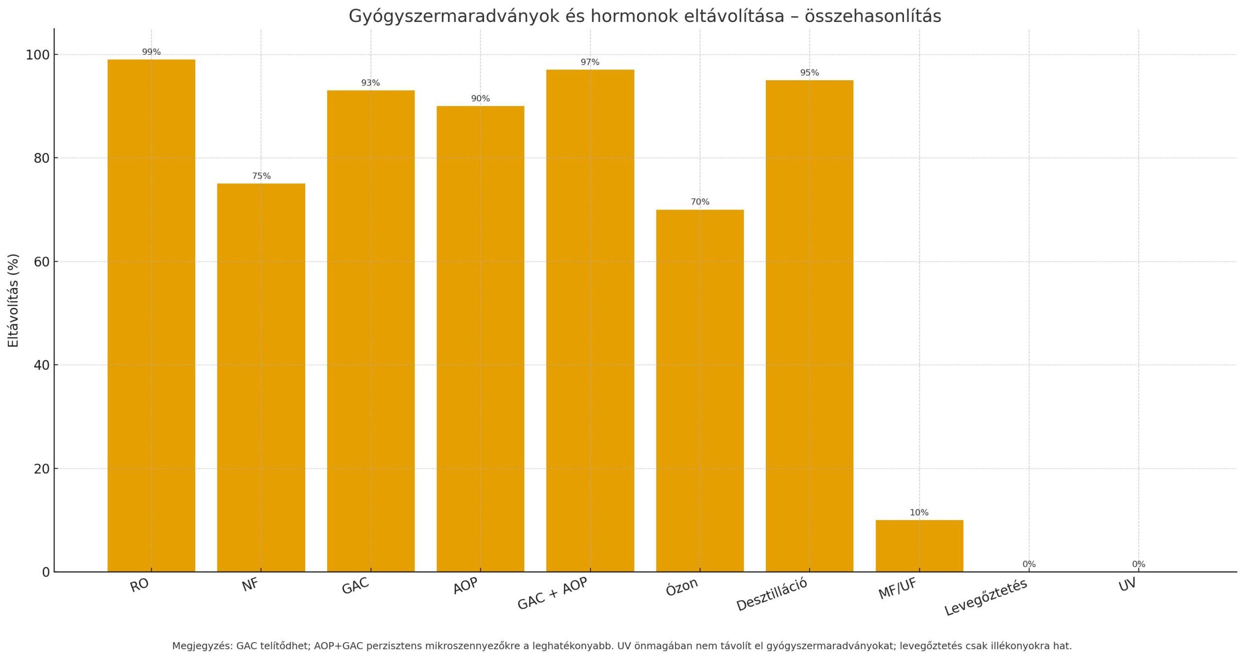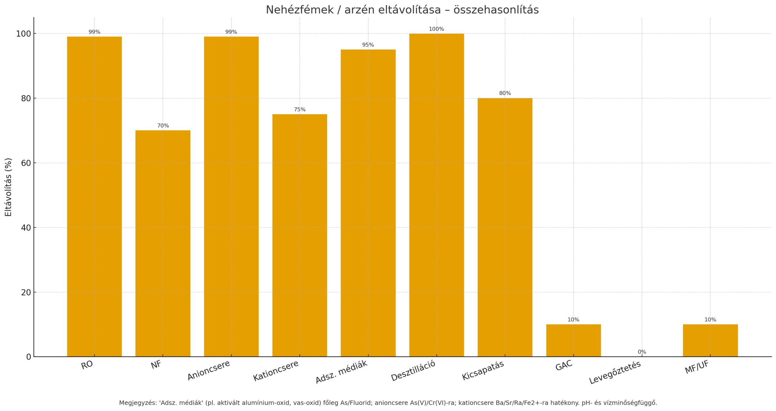 Fordított ozmózis (RO) Minden oldott anyag: sótartalom, összes ion, szerves anyagok, mikroorganizmusok TDS (teljes sótartalom): 95–99+%; Arzén, nehézfémek: >99%; Szerves anyagok: >99%; Baktériumok/vírusok: ~100% (steril filtrátum). Tengervíz vagy magas sótartalmú víz ivóvízzé alakítása; ipari ultra-tiszta víz előállítása. Nagy energiaigény, koncentrátum-kezelés szükséges.