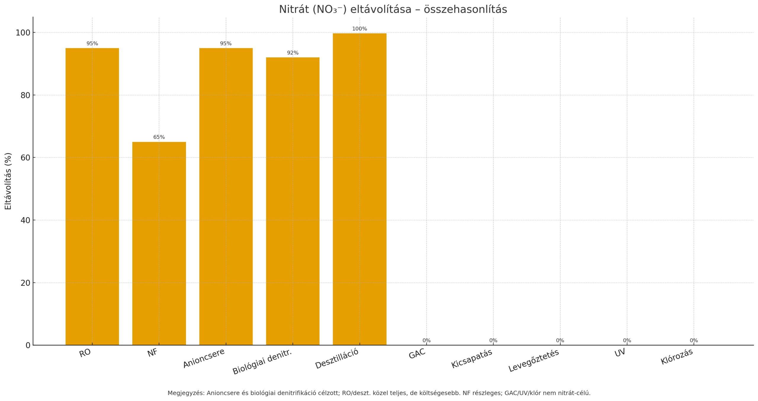 Ózonos fertőtlenítés Baktériumok, vírusok, protozoák; szerves mikroszennyezők oxidációja (részleges) Baktérium/vírus inaktiváció: ~99–99,99% (rövid CT időkkel); Giardia/Crypto: 99% körüli inaktiváció megfelelő dózisnál; Szerves anyag bomlás: változó (pl. 50–90%). Nagy vízművek elő- vagy utófertőtlenítésére, főként ahol klórmentes vizet akarnak vagy különleges szag-íz problémák vannak. Magas üzemeltetési költség, nincs tartós hatás a hálózatban.